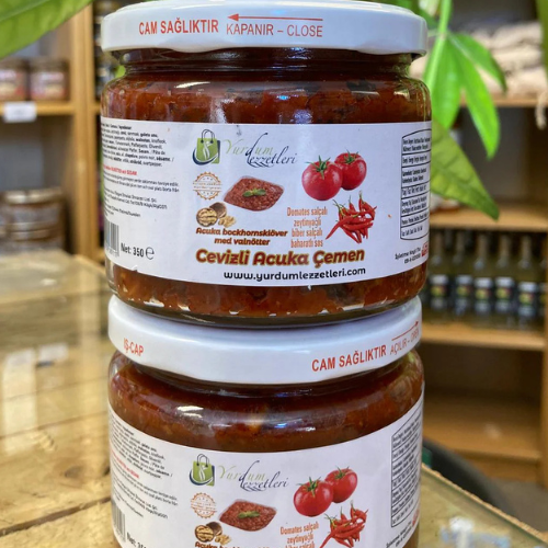 Ingredienser: tomatpuré, , pepparpasta ,Valnöt, salt, socker, , vitlök, ströbröd, svartpeppar, Sesam, korianderfrön, allkrydda, chilipeppar,sumak,kummin,mynta