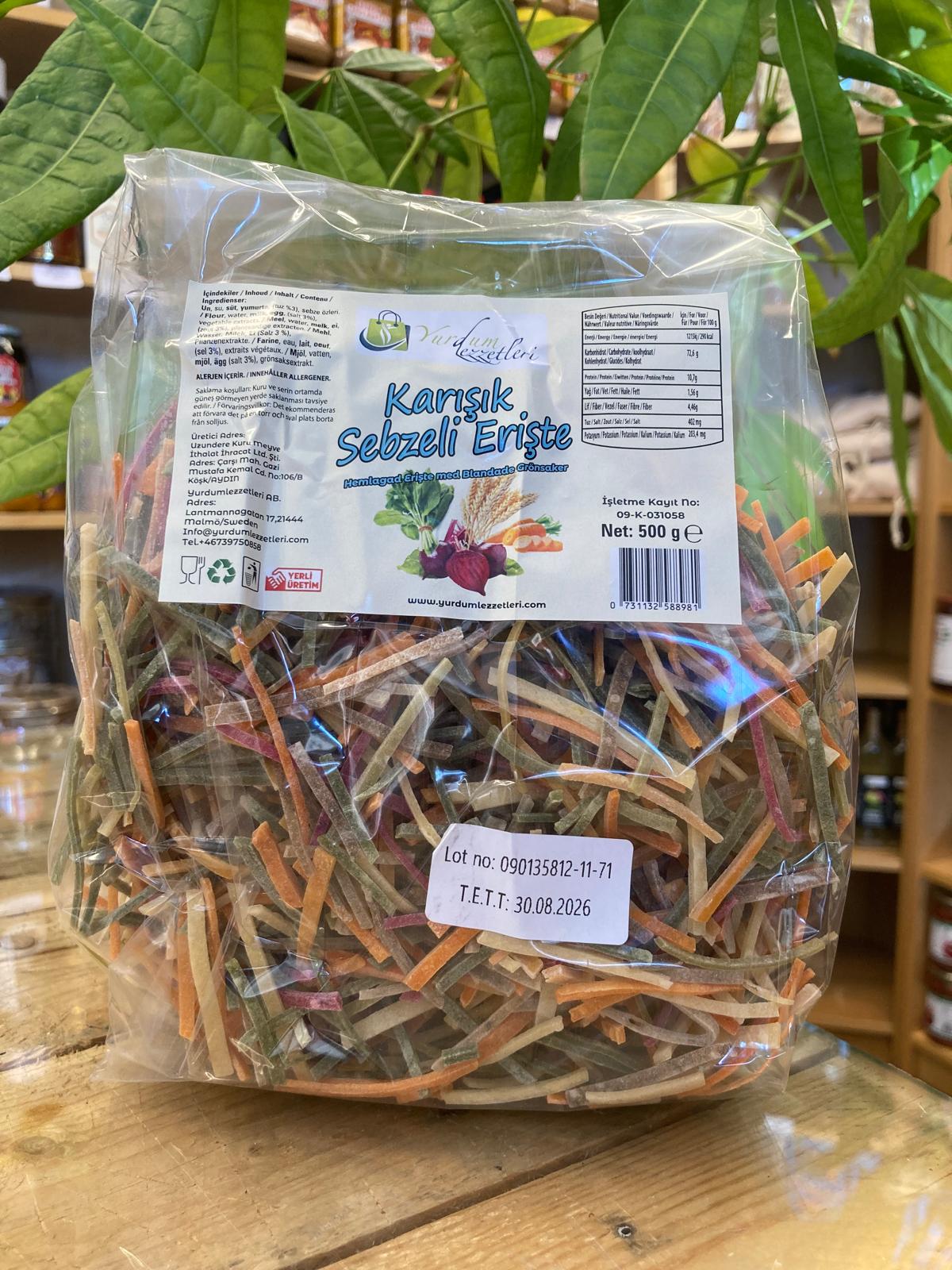Ingredienser: Spenat, Rödbetor, Ägg, Mjöl, Mjölk, Morot, Tomat, Salt,Det är en lokal och naturlig produkt.Det finns energi.1215 kcal i 1 portion grönsaksnudlar. 95 gram grönsaksnudlar innehåller 53,13 gram kolhydrater, 715 gram protein, 10,7 gram fett och 1,56 gram fiber.4i6g,salt.40g
