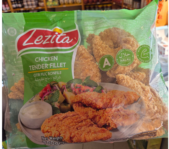 Ingredienser: Kycklingbröstkött 54%, överdragsmaterial (vetemjöl (gluten), modifierad majsstärkelse, potatisstärkelse, salt, kryddsmak, kryddblandning, jäsningsmedel (natriumbikarbonat), vatten, salt, vegetabilisk fiber, förtjockningsmedel (karragenan), stabiliseringsmedel (natriumtrifosfat), vegetabilisk olja (solrosolja)).